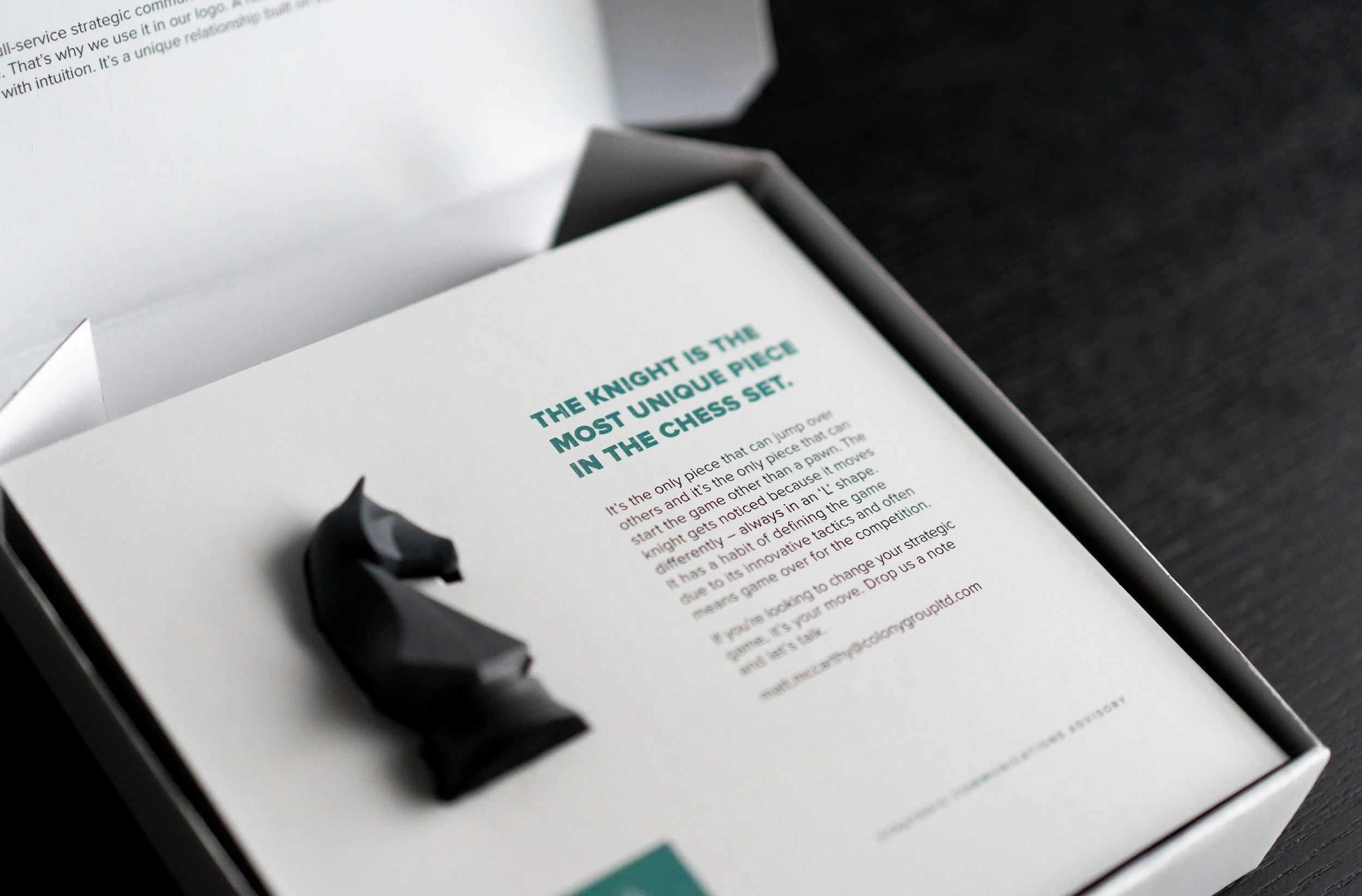 The Colony Chess Piece, a living representation of the agency's brand, became the centrepiece of this unique direct mail initiative. This multifaceted approach allowed Colony to communicate its brand narrative, emphasize the intrinsic value of relationships, and articulate a strategic vision directly to key decision-makers.